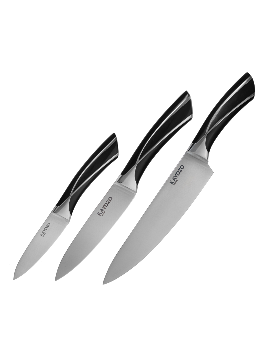 - Набор состоит из трёх качественных ножей японского производства: маленький овощной, универсальный и большой шеф-нож. Все ножи выполнены из прочной нержавеющей стали AUS-8, оснащены двойной заточкой и эргономичными ручками чёрного цвета.