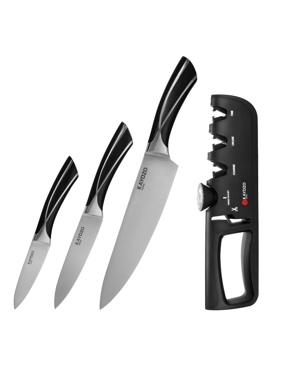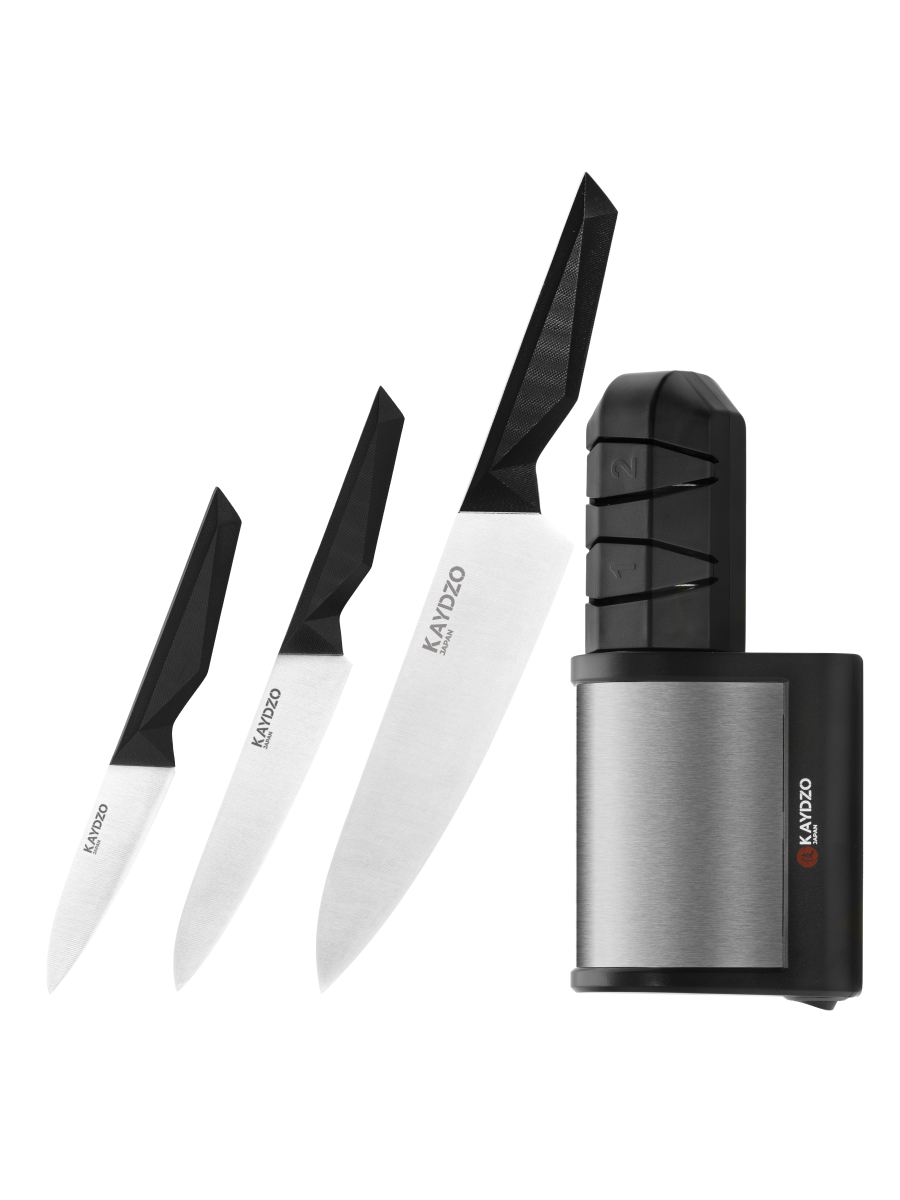Набор кухонных ножей с электрической точилкой Kaydzo- этот стильный и качественный набор кухонных товаров, гарантирующий функциональность, долговечность и элегантный внешний вид изделий. Комплектация набора: