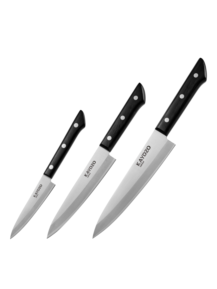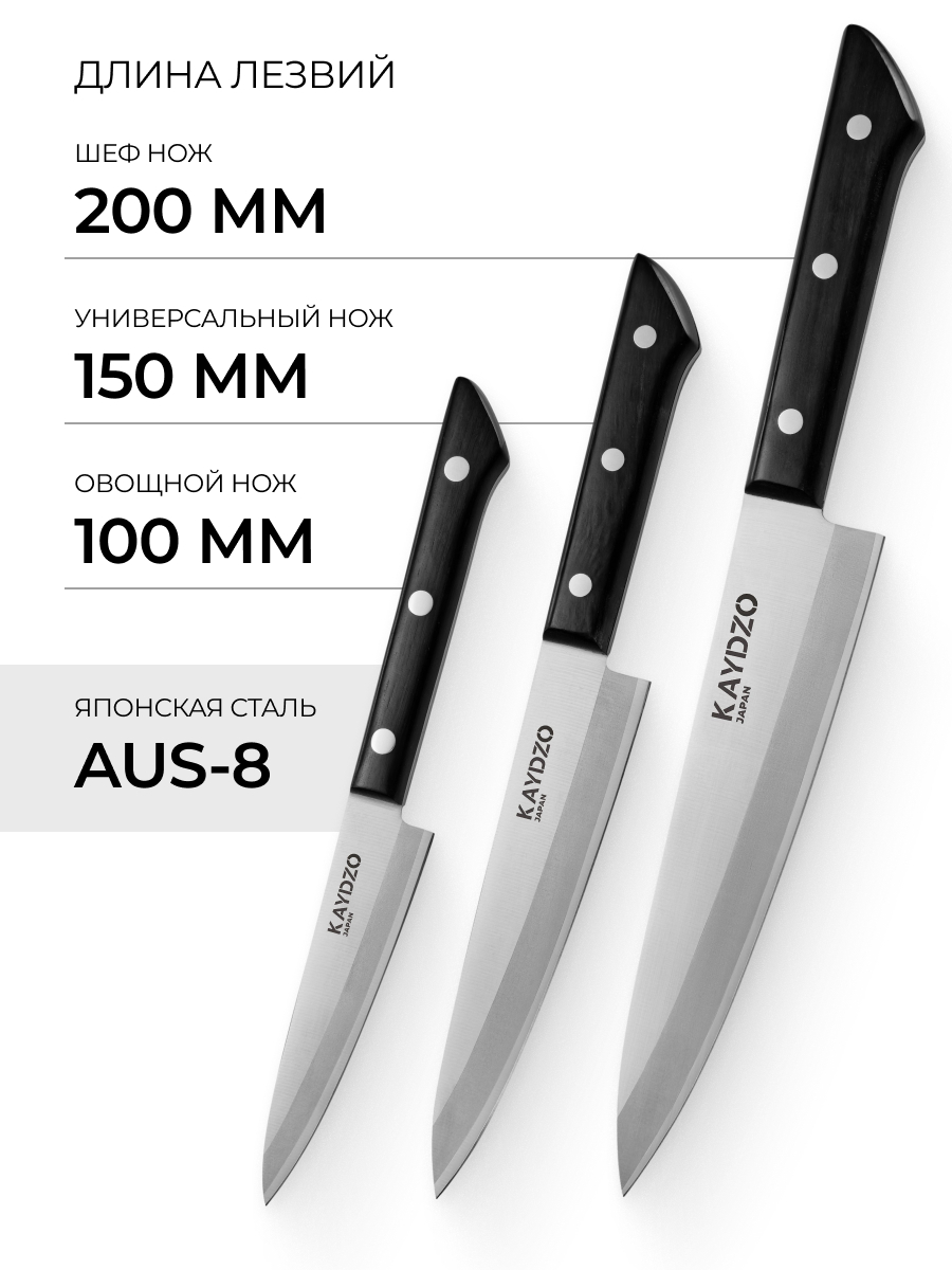 Набор японских кухонных ножей 3 в 1 KAYDZO REN AUS-8 KRN-3000 — это синтез многовековых традиций японских оружейников и прогрессивных инженерных разработок. Лезвия из высокоуглеродистой стали AUS-8 обладают исключительной износостойкостью, сохраняя безукоризненную остроту для безупречной работы с ингредиентами. В комплекте три профессиональных ножа: поварской, сантоку и универсальный, справляющихся с задачами любой сложности — от филигранной нарезки овощей до разделки мяса и рыбы.