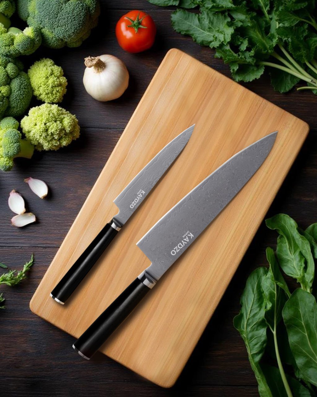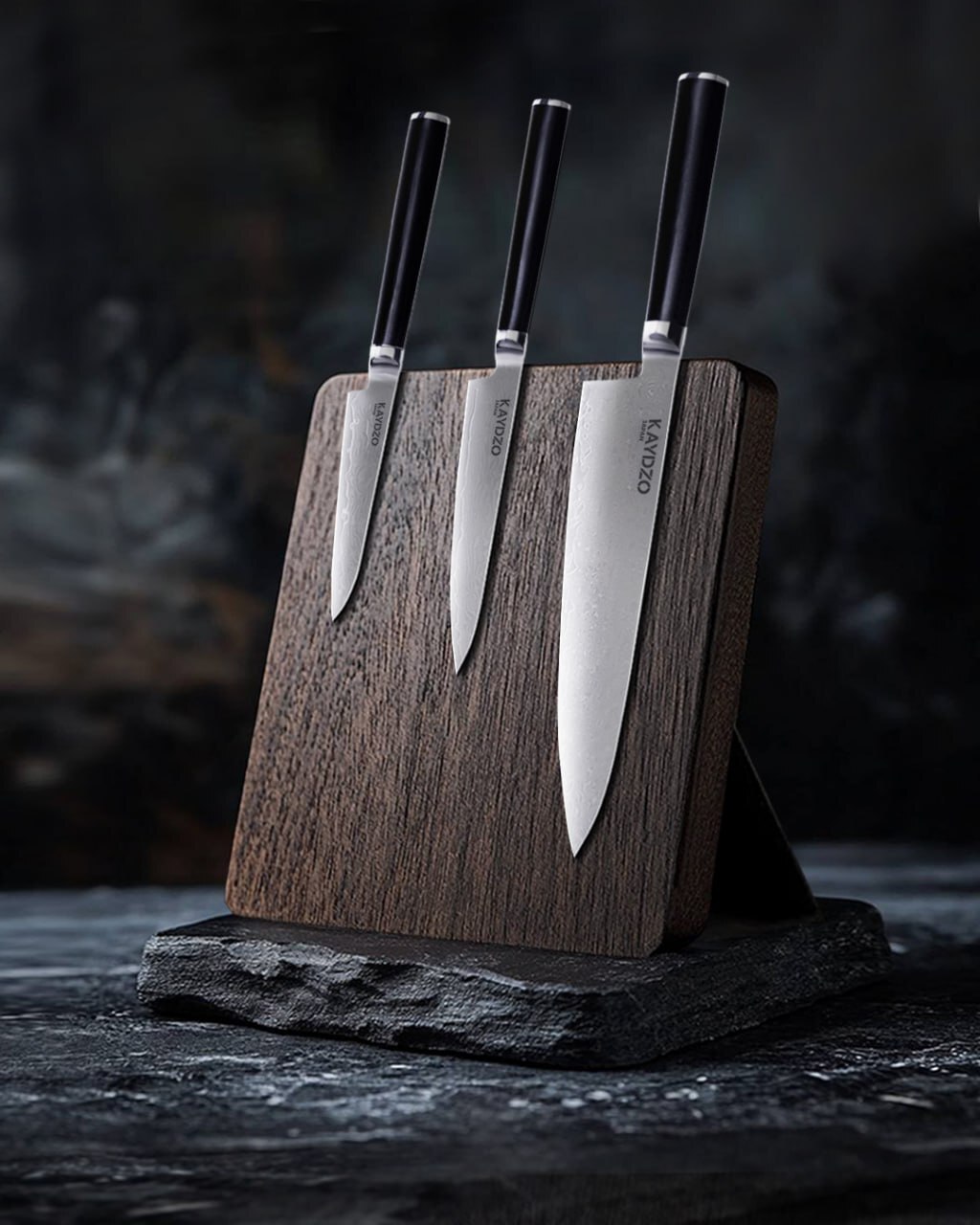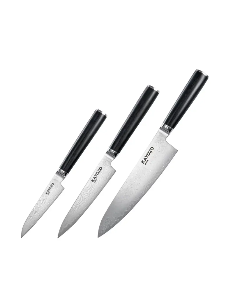 Набор японских кухонных ножей 3 в 1 KAYDZO Tokin Damascus KD-3000 — это гармония вековых традиций японского оружейного мастерства и передовых инженерных разработок. Лезвия из высокоуглеродистой стали VG-10 в обкладах из дамаска отличаются повышенной устойчивостью к деформации и истиранию, сохраняя идеальную остроту для филигранной обработки ингредиентов. В комплекте три профессиональных ножа: шеф-нож, сантоку и универсальный, созданные для решения разнообразных задач — от тонкой нарезки овощей до работы с мясом и морепродуктами.