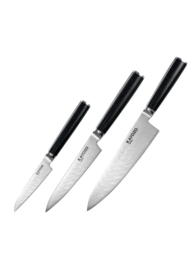 KAYDZO - известный бренд японских кухонных ножей. Кайдзо - это качественные и стильные ножи и аксессуары , которые будут радовать вас безупречной функциональностью и эстетичным дизайном каждый день! Ножи от бренда Кайдзо поставляются в наборе из трех штук, в подарочной упаковке в виде стильной коробочки (коробки для хранения). Комплект включает овощной, универсальный и шеф - нож, удобный также в виде ресторанного. Качественные изделия изготовлены из прочной японской стали AUS-8, украшены изящной гравировкой и логотипом бренда. Изысканную модель отличает серо - серебристый цвет рабочей части, антибактериальное покрытие и двойная заточка для остроты металлических лезвий. Эргономичная рукоятка - ручка матового черного цвета удобно лежит в руке.