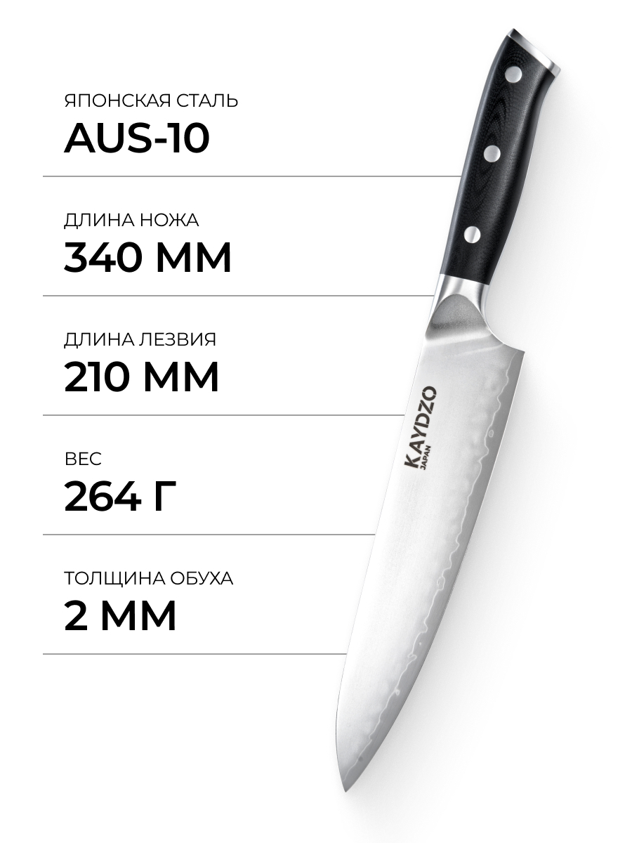 Японский кухонный нож KAYDZO RONIN шеф-нож сталь AUS-10 KR-2000 — это идеальное сочетание точности, надежности и эстетики. Лезвие из высокоуглеродистой стали AUS-10 премиум-класса отличается исключительной прочностью и износостойкостью, сохраняя остроту даже при интенсивной эксплуатации. Благодаря оптимальному содержанию углерода нож легко справляется с деликатной нарезкой овощей, филигранной разделкой рыбы и обработкой мяса, гарантируя безупречный результат.
