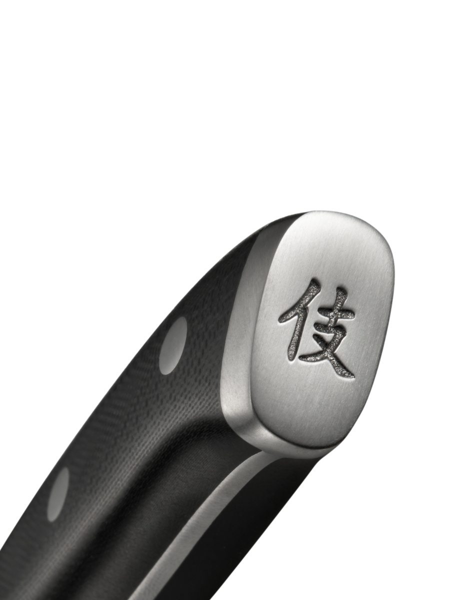Эргономичная рукоять с влагоотталкивающим покрытием обеспечивает надежный хват и комфорт, минимизируя усталость рук при длительном использовании. Ее анатомическая форма продумана до мелочей, чтобы движения были точными и безопасными. Лаконичный дизайн ножа, вдохновленный японской философией «ваби-саби», подчеркивает гармонию функциональности и изящества.