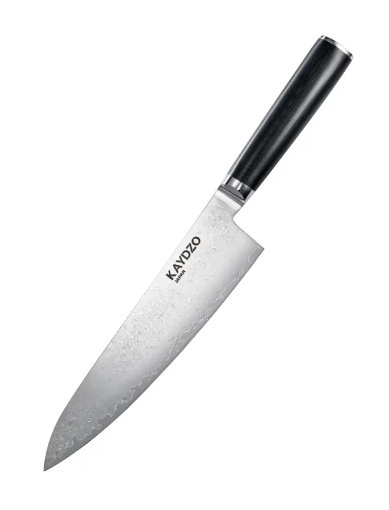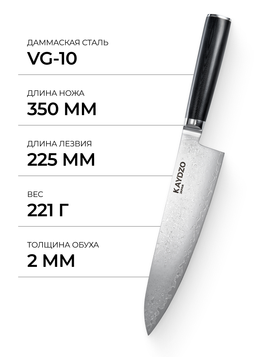 Японский кухонный нож KAYDZO TOKIN Damascus шеф-нож KD-2000 — это идеальное сочетание точности, надежности и эстетики. Лезвие из высокоуглеродистой стали VG-10 в обкладах из дамаска отличается исключительной прочностью и износостойкостью, сохраняя остроту даже при интенсивной эксплуатации. Благодаря оптимальному содержанию углерода нож легко справляется с деликатной нарезкой овощей, филигранной разделкой рыбы и обработкой мяса, гарантируя безупречный результат.