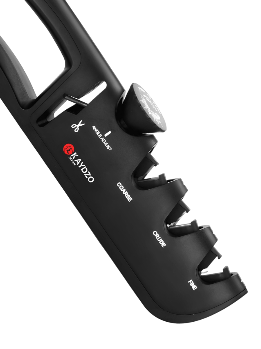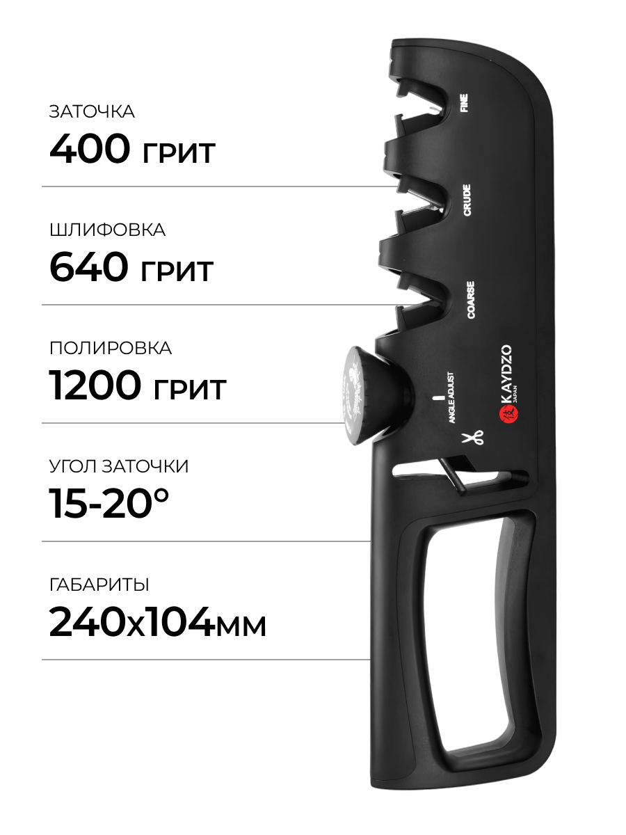 Для выполнения заточки достаточно провести лезвие по рабочей части устройства, и благодаря оптимальной конструкции точилка устойчиво располагается на поверхности, снижая риск скольжения. Стильная ножеточка от японского производителя Кайдзо профессионально точит разные поварские ножи с металлическими гранями и лезвием, чтобы они всегда были острыми, как нож самурая, и пригодными для готовки.