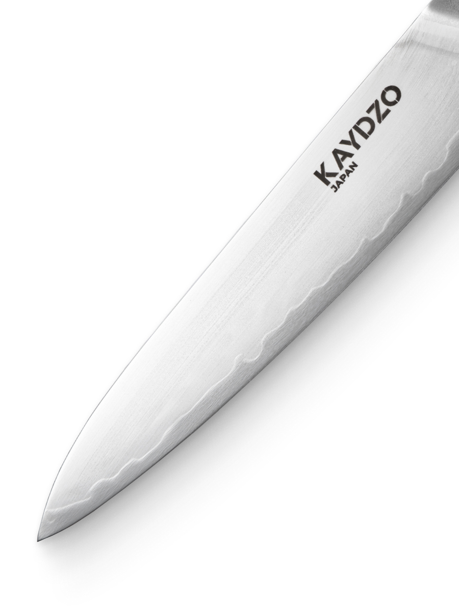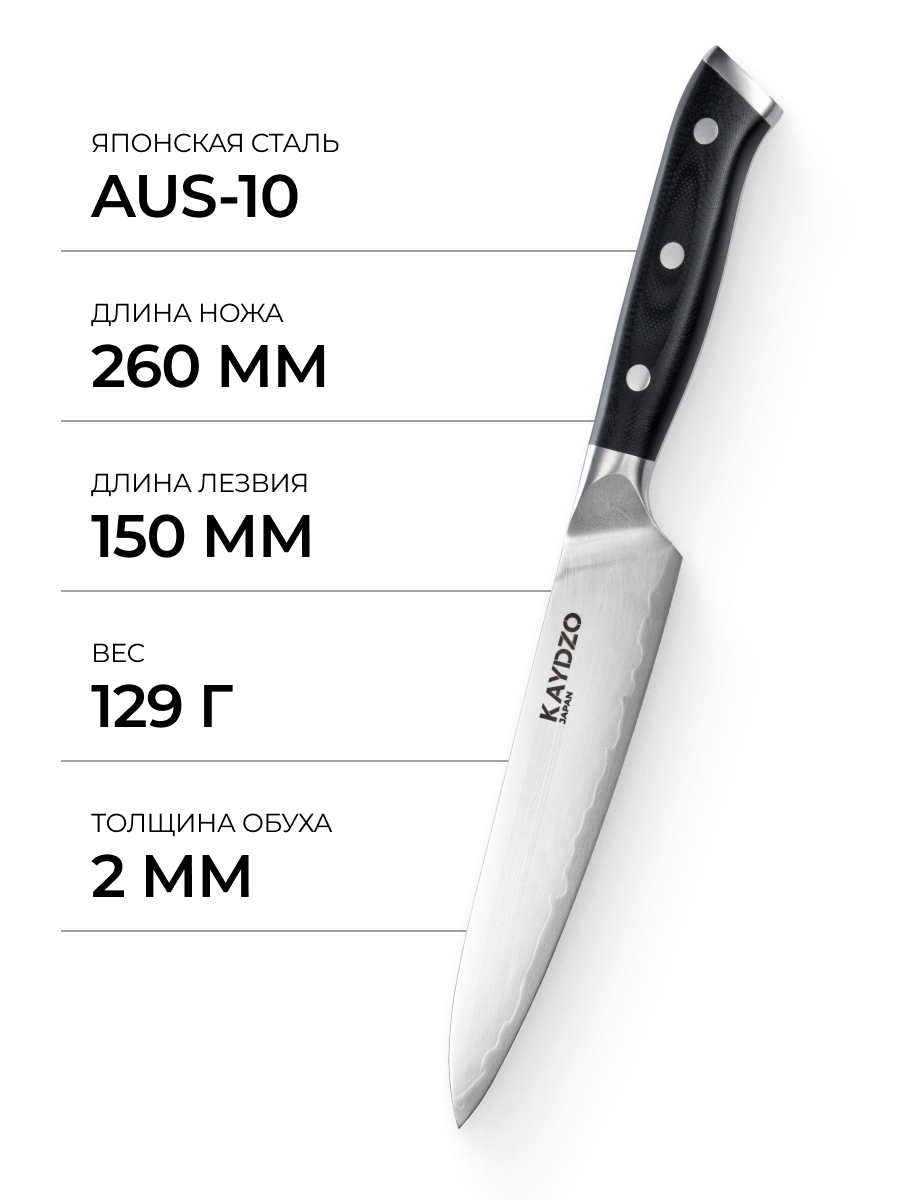 Японский кухонный нож KAYDZO RONIN универсальный сталь AUS-10 KR-1500 — это идеальное сочетание точности, надежности и эстетики. Лезвие из высокоуглеродистой стали AUS-10 премиум-класса отличается исключительной прочностью и износостойкостью, сохраняя остроту даже при интенсивной эксплуатации. Благодаря оптимальному содержанию углерода нож легко справляется с деликатной нарезкой овощей, филигранной разделкой рыбы и обработкой мяса, гарантируя безупречный результат.