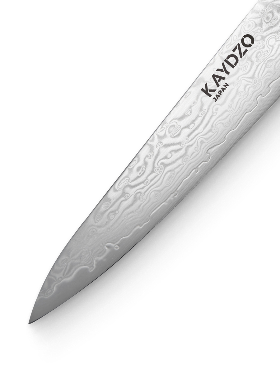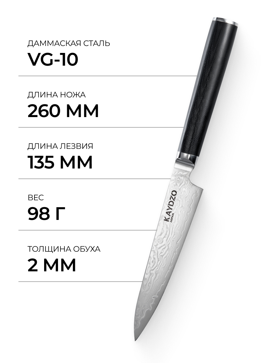 Японский кухонный нож KAYDZO TOKIN Damascus универсальный KD-1300 — это идеальное сочетание точности, надежности и эстетики. Лезвие из стали VG-10 в дамасских обкладах премиум-класса отличается исключительной прочностью и износостойкостью, сохраняя остроту даже при интенсивной эксплуатации. Благодаря оптимальному содержанию углерода нож легко справляется с деликатной нарезкой овощей, филигранной разделкой рыбы и обработкой мяса, гарантируя безупречный результат.